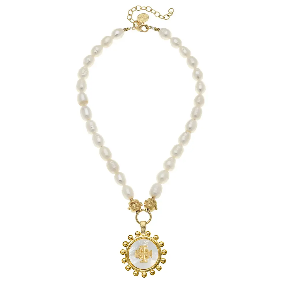 Gold with Mother of Pearl Jerusalem Cross on Large Chain Necklace